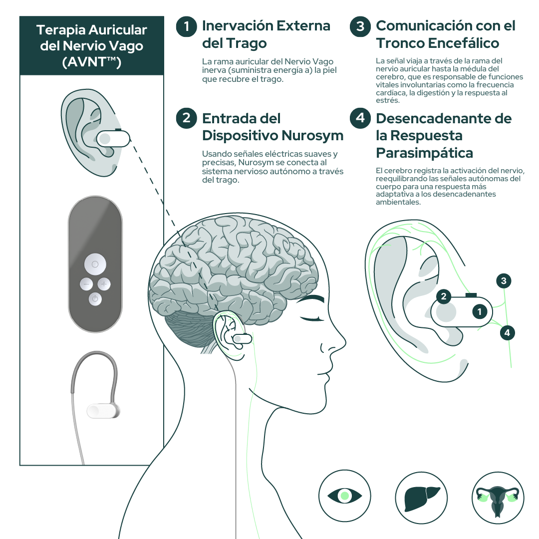 Al modular su actividad mediante la entrega precisa de señales y al dirigirse al nervio correcto (efecto en el objetivo) pero no a otros nervios (efecto fuera del objetivo), Nurosym puede optimizar esta vía crítica, asegurando una comunicación fluida entre el cerebro y el cuerpo para proporcionar beneficios de amplio alcance.