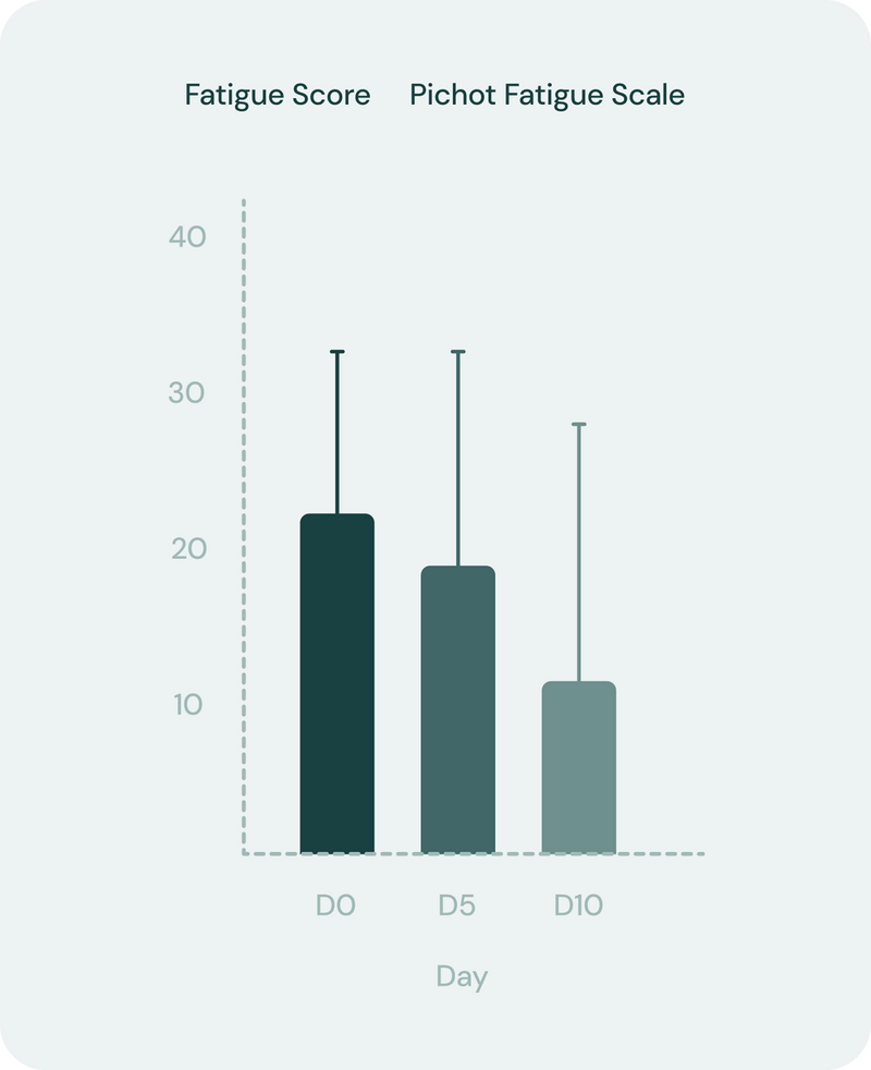 Nurosym neuromodulation has demonstrated a beneficial effect on fatigue by modulating the autonomic nervous system, leading to enhanced energy levels and reduced sensations of exhaustion. In the study, patients reported sustained improvements even one week after discontinuing the therapy, indicating prolonged relief from fatigue-related symptoms.(Figure) Fatigue was assessed using the Pichot fatigue scale scores during therapy (D0: day 0, D5: day 5 and D10: day 10). The results revealed a substantial reduction in fatigue, registering approximately 48% improvement (D0 vs. D10, p < 0.0001) after Nurosym neuromodulation therapy.