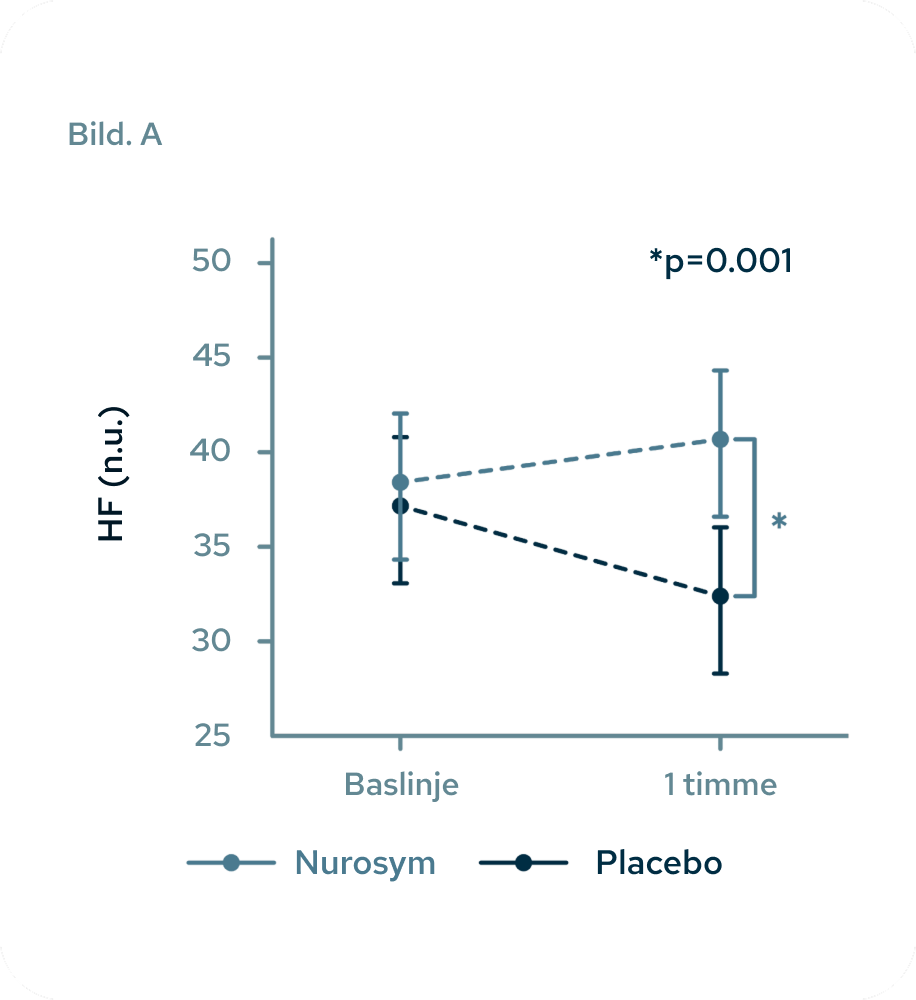 Det parasympatiska nervsystemet är kroppens interna mekanism för avslappning och vila. HRV (hjärtfrekvensvariabilitet) är en indikator på vagusnervens aktivitet. Förbättringar i dessa HRV-parametrar indikerar riktad stimulering av vagusnerven och aktivering av psykofysiologiska självreparationsmekanismer. I en klinisk prövning visade en timmes session med Nurosym positiva förändringar i alla HRV-parametrar jämfört med placebo. Bilden (A) visar att högfrekvent HRV ökade signifikant (*p=0,001). Bilden (B) visar att lågfrekvent HRV minskade signifikant (*p=0,001). Figur (C) visar att kvoten LF till HF minskade signifikant (*p=0,002).